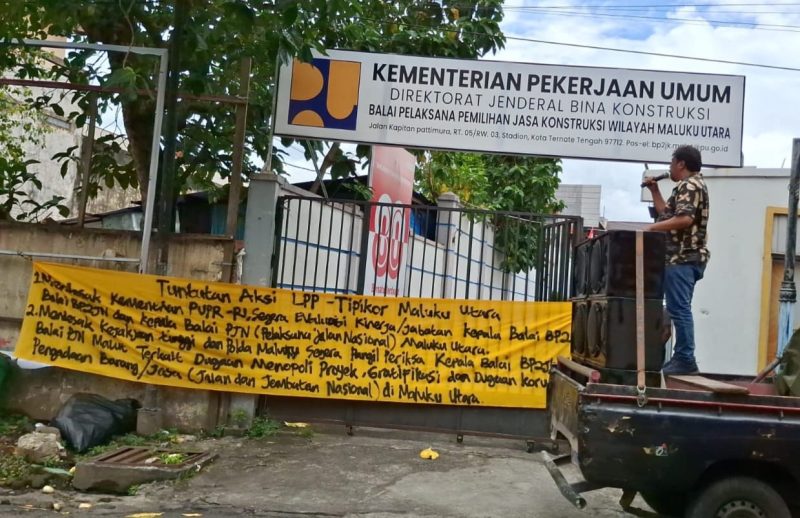 Alan Ilyas, sang koordinator LPP Tipikor, berdiri di atas mobil komando dengan suara lantang. “Lima tahun sudah BP2JK Malut ini jadi sarang tikus-tikus berdasi, Tender proyek Kementerian PUPR dikangkangi, uang rakyat dikuras habis teriaknya.